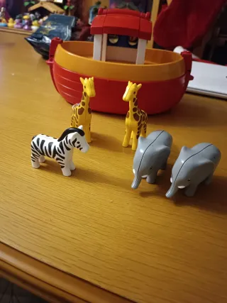 Barco del Arca de Noé de Playmobil, ideal para coleccionistas o para jugar. - Incluye animales como cebras, elefante y vaca. - Piezas de plástico de colores. - El barco es de color rojo y naranja.faltan las 2 jirafas