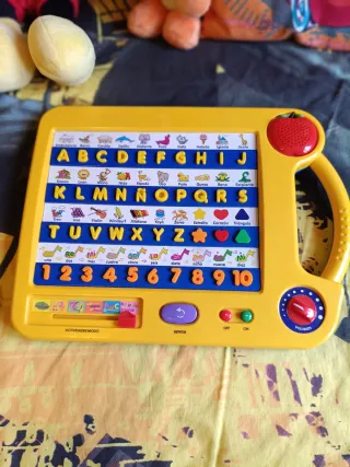 Divertido juego educativo para niños con letras y números. Se trata de un juguete educativo interactivo de aprendizaje del abecedario y los números. Presenta el abecedario de la A a la Z con imágenes de objetos o animales correspondientes (Ambulancia, Barco, Cerdito, etc.). Incluye los números del 1 al 10. Cuenta con botones de control de volumen y modos de actividad. El texto y el idioma principal que se muestra es el español. - Incluye el abecedario completo. - Contiene los números del 1 al 10. - Diseñado en color amarillo. - Incorpora diferentes actividades y modos de juego.