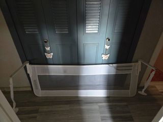 Barrera de seguridad para cama. - Color blanco. - Malla transpirable. - Incluye bolsa de transporte. -barrera abatible -apenas tiene días de uso , no me sirve por que mi somier es tapizado , lo aconsejo para somieres laminados