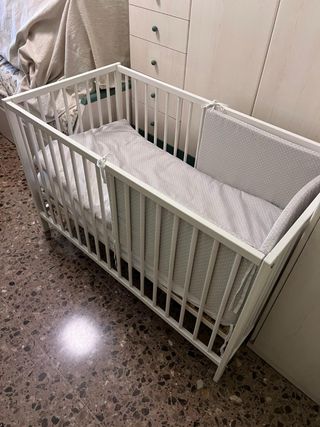 Cuna blanca de Ikea modelo Sundvik, en perfecto estado sin ningún daño. Incluye colchón ergonómico y capa protectora transpirable también en perfecto estado. Lo utilizamos solo por 6 meses con la bebe porque estuvimos fuera todo el tiempo. La cuna original cuesta 150 EUR, el colchón 50 EUR y la capa protectora de colchón IKEA cuesta 15 EUR. - Estructura de madera. - Barreras de seguridad. - Colchón y capa protectora incluido.