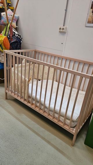 Cuna de IKEA en muy buen estado, ideal para tu bebé. Incluye colchón. - Estructura de madera clara. - Barreras de seguridad. - Base del colchón ajustable. - Incluye protector y sabanas Recogida mercat de Sant Antoni