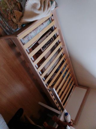 Vendo cuna colecho con barrera que se pone y se quita, o se queda a media altura (en la foto está sin ella a modo de cama normal). El somier se puede colocar en diferentes alturas para ajustar a medida que va creciendo. Tiene ruedas. Sólo tiene unos picotazos en un lateral (ver en foto). La vendo con la barrera de Ikea, el colchón (de muy buena calidad) y la chichonera.