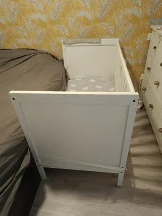 Cuna de bebé de Ikea lacada en blanco de 124 X 66 cm. Incluye la barrera lateral para transformarla en cama. Algún roce que muestro en las ultimas fotos, pero está en buen estado. Incluye colchón de 120X60 de espuma con funda lavable. Siempre se ha usado con protector, está en buen estado. El precio de la cuna + colchón fue de 185€