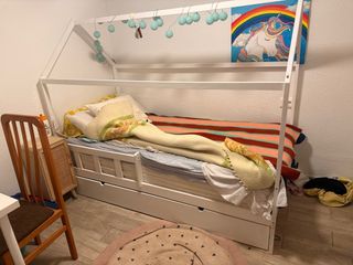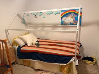 Cama nido tipo montesori en forma de casita en madera natural, esta a estrenar ya que no la ha llegado a utilizar. Se vende con su barrerra de proteccion incluida, muy comoda y practica. (Colchones no incluidos). Medidas: 90 cm ancho x 200 xm largo