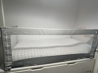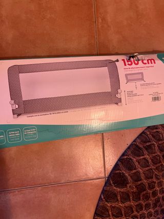 Barrera de seguridad en perfecto estado de uso, casi nueva. Ideal para peques que empiezan a dormir en cama grande. -Medidas: 1,50 m de largo x 55 cm de alto. -Gris con estrellas blancas. -Apta para todo tipo de camas (incluida nido y canapé). -Se baja y sube fácilmente para hacer la cama o coger al niño/a. -Tela de rejilla para ver al peque mientras duerme. -Único detalle: el dibujito tiene un pequeño descosido, sin afectar a la seguridad ni al uso (última foto). -La cama de la imagen es de 90x200.