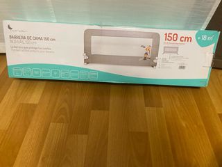 Barrera de cuna nueva, sin uso, ya que no era el tamaño correcto. Dimensiones 180 × 80 cm, con longitudes ajustables de 150, 180 o 200 cm. Rieles regulables entre 64 y 96 cm, se adaptan a distintos tamaños y a la altura del colchón. Fabricada en acero al carbono resistente y tejido de lino transpirable, segura y cómoda para el bebé. Funda de malla lavable, plegable y desmontable para fácil limpieza y almacenamiento. Montaje sencillo y diseño moderno. Precio original: 39 €.