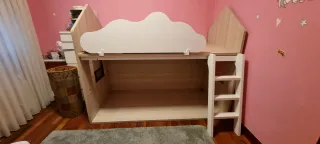 Se vende cama nido infantil con carro extraíble, ideal para habitaciones de niños. - Estructura de madera blanca. - Incluye barrera de seguridad. - Colchón superior con funda de globos.