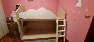 Dos camas literas pegables. 90 ×190. Muelle hidráulico que permite un fácil manejo sin esfuerzo. Son independientes, ( en mi caso solo se ha usado la de abajo ) en una niña de 6años) . La colocación de la escalera es apoyar y enroscar, osea muy fácil. Y tiene una pequeña barrera de quita y pon. Color morado el frontal de la cama de arriba y blanco el frontal de abajo. Los tiradores son verdes pistacho. Se incluye colchones y almohadas. Precio negociables. La puerta blanca se ha caído, sería ponerle otra vez los tornillos.