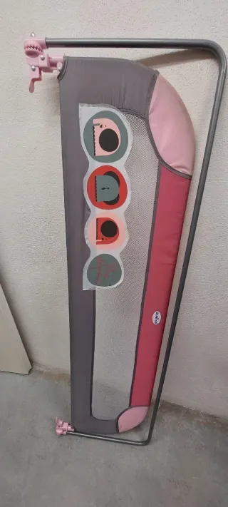 Barrera de seguridad para cama infantil, ideal para evitar caídas durante la noche. - Estructura metálica. - Tejido de malla transpirable. - Diseño en color gris y rosa. - Incluye elementos decorativos circulares.