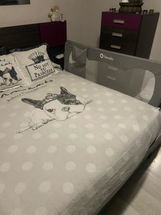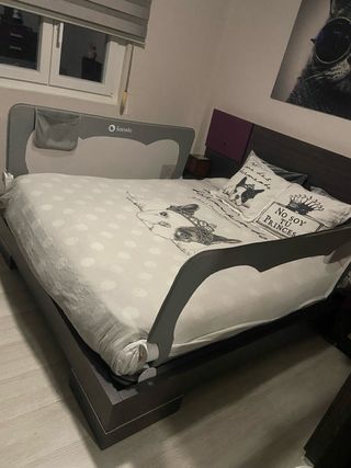 Protección de seguridad para cama. Es una barrera de seguridad que se puede poner en cualquier cama. Evita que los niños se puedan caer. Se pliega muy facil y tiene funda de transporte. Esta como nueva. No envio, solo recogida en Cáceres capital.
