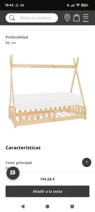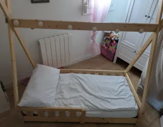 Cama TIPI infantil de madera natural Cama infantil tipi 80x160 cm color natural con colchón espuma Características: Entrada hasta el suelo Barreras laterales. Material de alta calidad De madera de pino natural Se puede cargar hasta 100 kg Marco de listones con 10 listones. Construcción robusta Fácil de montar. Altura: 150 cm Longitud:168 cm Profundidad: 86 cm Colchón: H10cm Estado: cómo nueva Precio estructura cama: 100€ Estructura cama+colchon: 120€