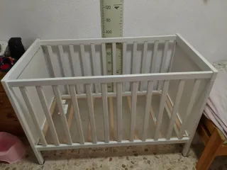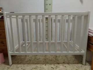 Cuna de IKEA en color blanco. Un mueble esencial para el descanso del bebé. - Diseño clásico y funcional. - Barreras de seguridad. - Incluye colchón. (( Solo tiene una mijita que lo puedo pintar ))
