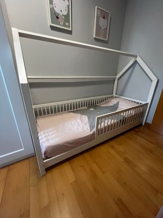 Cama casita modelo B Plus de Mon Lit Cabane en color blanco, tamaño 80×190 cm. Está en perfecto estado y lista para su próximo hogar 😊 Incluye somier de láminas de madera (ya integrado). Muy cómoda, ventilada y de calidad. Diseño con barandilla integrada, pensada para dar seguridad sin necesidad de añadir barreras externas. Tiene patas de unos 4 cm de altura, lo cual permite limpiar por debajo fácilmente, algo que muchos modelos no ofrecen. – Estructura de madera robusta, estilo Montessori. – Tamaño 80×190 cm. – Barandilla fija integrada en el diseño. – Somier de láminas incluido. – Patas Actualmente montada en Esplugues de Ll.
