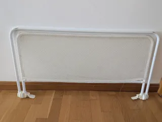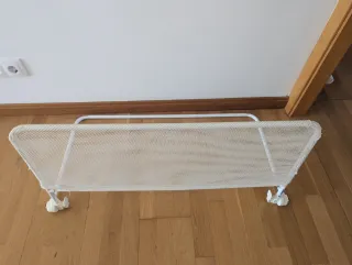 Barrera de seguridad para cama infantil de la marca Jané. Mide 84 cm de largo y 43 cm de alto. Es decir que asoma por encima del colchón 43 cm menos lo que mida el colchón de alto. - Color blanco. - Estructura de metal con malla. - Plegable para facilitar su transporte y almacenamiento. Tiene algo de desgaste en la parte que queda debajo de la cama, tal como se aprecia en la foto.