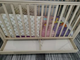 Cuna convertible con un práctico cambiador incorporado.Cajon con cama nido Ideal para el cuarto del bebé. - Cuna con barrotes blancos. - Cambiador con funda estampada. - Cajonera de tres cajones. La parte del escritorio está todo sin estrenar. La única parte que está un poco daña es la barrera de la cuna por arañazos