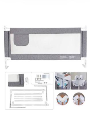 Barrera de seguridad para cama de bebé o niño, de 150 cm de largo y color gris.se puede entregar en centro comercial xanadu en las tardes o en Toledo Hormigos o disponible para envíos - Tejido de malla transpirable. - Bolsillo lateral. - Estructura metálica. - Incluye accesorios de montaje.