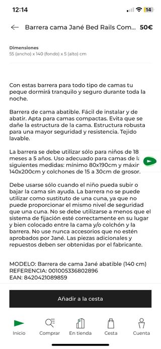 La barrera está como nueva. Tiene todas las piezas intactas, como se ve en las fotos, y se entregan en la bolsa original. Comprado en tienda cuesta 39€. Sistema de seguridad: correas extensibles para impedir el desplazamiento de la barrera Abatible No hace falta extraerla para hacer la cama Desmontable Fácil instalación debajo del colchón Bolsa de transporte Medida máxima de la correa de seguridad: 105cm
