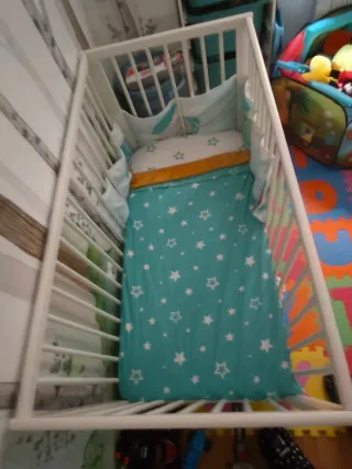 Cuna de madera de ikea con colchón bamboo desenfundable con lado de invierno y de verano. Limpio y sin manchas. 120*60, adaptada a colecho, regalo una bolsa grande de ropa de cuna que incluye chichoneras, edredon, sabana de invierno y de verano, relleno nordico, cubre colchón... También regalo saco de cuco de tuc tuc y algunas cosas más (todo lo de la bolsa de la última foto). Tengo la barrera que falta por si se quiere usar completa - Estructura de madera - Barreras de seguridad - Incluye colchón y ropa de cama Es un regalo, por quitarmelo de enmedio.