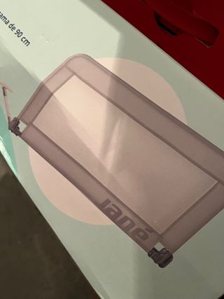 Barrera de seguridad para cama de viaje de la marca Jané. Es plegable y fácil de transportar. Estructura de metal. Malla de tejido. Las medidas son: 85 cm de largo x 32,5 cm de alto y la parte de la barrera que se introduce bajo el colchón entraría 44 cm