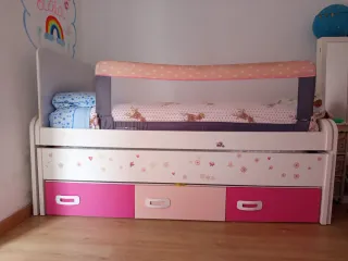 Cama infantil de madera, ideal para la transición de la cuna a una cama más grande. Su diseño blanco se adapta a cualquier habitación. - Estructura de madera resistente. - Somier de láminas. -Incluye colchón. La cama es igual q la de la foto pero sin barreras,esque para mostrar como es la cama busque una imagen igual,ya que la mía está desmontada. Tiene un cajón debajo con otra cama. Regalo de los dos colchones.