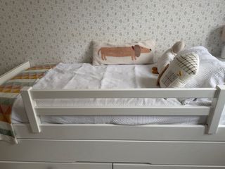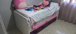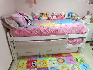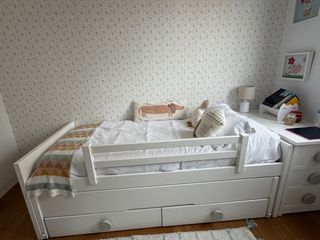 Cama nido infantil con un diseño divertido y práctico, ideal para habitaciones de niños. - Estructura de madera blanca. - Incluye dos cajones de almacenamiento. - Barrera de seguridad de seguridad - Colchones no sé venden -Funda de princesa y peluche no sé venden Sólo tiene 4 años la cama nido Utilizado 3 años.