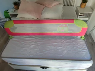 Nunca usada, en perfecto estado. Para evitar las caídas de la cama mientras el niño duerme, el uso de una barrera se hace imprescindible. De fácil instalación debajo del colchón con anclajes que la fijan a la cama y con un sencillo sistema abatible para que el niño o la niña pueda entrar y salir de la cama con facilidad y que permite hacer la cama sin necesidad de quitarla. Se incluye libro de instrucciones.