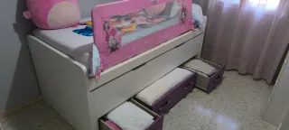 Cama nido en buen estado, ideal para habitaciones infantiles o juveniles. Incluye espacio de almacenamiento. - Estructura blanca. - Cajones de color morado. - Incluye barrera de seguridad rosa.