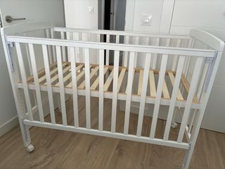 Cuna de bebé en excelente estado, utilizada muy poco. Su diseño blanco se adapta a cualquier habitación infantil. - Estructura de madera lacada en blanco. - Barreras de seguridad. - Base para colchón ajustable en altura. - Ruedas para facilitar su movilidad.