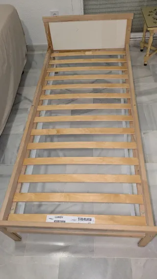 Se vende esta práctica cama IKEA, ideal para la transición de la cuna a una cama más grande. Fabricada en madera de haya. - Estructura de cama con somier de lamas. - Incluye barrera protectora lateral. - Medidas para colchón de 70 cm. Se regala colchón, sábanas y colcha de corazones de Ikea.