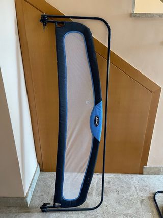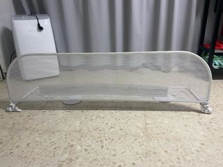 Barrera de color blanco para evitar caídas en la cama. Es una estructura de metal (resistente) forrada de un tejido de malla (transpirable con muchos agujeros). El tejido cede un poco al apoyarse, por lo que resulta muy cómodo si te apoyas. Es fácil de lavar con una bayeta o un paño húmedo. Cuando está colocada, es como una “L”. Tiene unas barras largas que se colocan entre el colchón y el somier, con lo que la barrera queda bien fijada. Además tiene unas correas que acaban en unos topes, para asegurarla aún más. Es abatible y se pliega con mucha facilidad por medio de unas ruedas dentadas (ver fotos) y se queda completamente plana. Es cómoda de guardar. Tiene uso pero está en perfecto estado, como se puede ver en la fotos. ***¡¡¡OJO A LAS MEDIDAS PARA EL ENVÍO!!!*** (no todas las empresas lo cubren) Medidas aproximadas 35 cm de alto 150 cm de largo