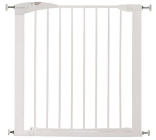 Barrera de seguridad Safety 1st Auto Close, ideal para mantener a los niños seguros. Su diseño es blanco y metálico. - Mecanismo de cierre automático. - Fácil instalación sin necesidad de taladros.