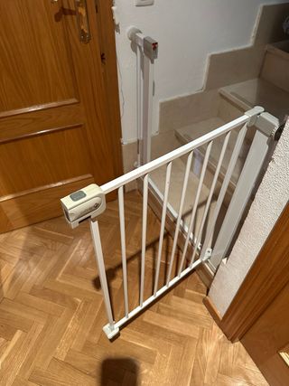 Barrera de seguridad ideal para mantener a los más pequeños a salvo. Se ajusta a diferentes anchos de paso. - Color blanco. - Mecanismo de cierre seguro. - Fácil de instalar. Hay una en buen estado y se regala otra para apaño.
