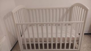 Cuna de bebé de color blanco más colchón. - Regulable a 2 alturas. - Estructura de madera. - Barreras de seguridad. - Incluye colchón.