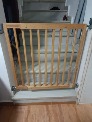 Barrera de seguridad de madera para escaleras o accesos. Incluye los soportes de montaje. - Material: Madera. - Color: Natural. - Incluye herrajes de fijación.