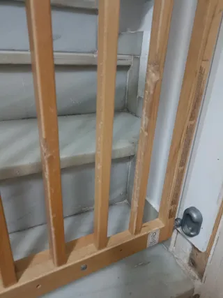 Barrera de seguridad de madera para escaleras. Ideal para delimitar espacios y prevenir accidentes. - Fabricada en madera. - Diseño de barrotes verticales. -Desperfecto por mordedura de perro