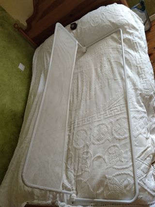 barrera anticaida para cama, con cintas para ajustar al colchón, es plegable se puede abatir una vez levantada. medidas 149 x43 es desmontable y se entrega lavado.