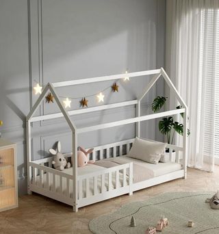 Cama estilo Montessori, ideal para habitaciones infantiles. Su diseño abierto fomenta la independencia. - Estructura de madera blanca. - Diseño de casita. - Incluye barreras de seguridad.