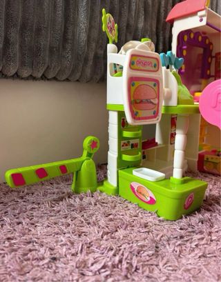 Centro comercial de Pin y Pon. Con accesorios. Zona de comida ( hamburguesería planta baja y heladería arriba. Les une un elevador). Zona de ropa. Se divide en tres platas. Planta baja ( la caja, incluye bolsitas, ordenador, tarjeta, etc.) en la segunda planta hay un probador con cortina y espejo. Arriba del todo es la azotea. Por otro lado hay un apartado con perchas y prendas colgadas. Para subir arriba hay un ascensor y las puertas del centro comercial se abren con un botón. Además tiene la barrera de parking. Está todo completo, tal como se ven en las fotos y las plataformas elevadoras funcionan muy bien. SOLO ENVIOS