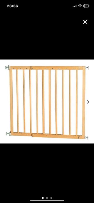 Barrera de seguridad de madera, ideal para delimitar espacios. - Fabricada en madera clara. - Diseño con barrotes verticales. - Mecanismo de apertura y cierre. La barrera de seguridad Nele de Star Stairs protege a los niños ante peligros en puertas y escaleras. Fabricada en madera maciza barnizada, puede instalarse en vanos de entre 62,8 y 104,5 cm. Debe fijarse sobre un suelo firme y estable mediante los cuatro tornillos de sujeción. Está pensada para niños de hasta 24 meses y es de uso doméstico