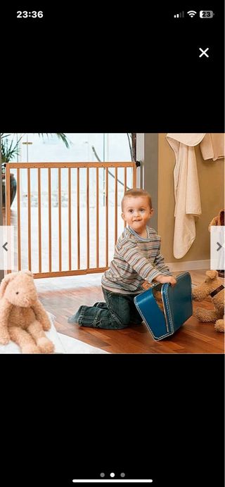 Preciosa barrera de seguridad para niñ@s y mascotas, en color gris. Está en buen estado. - Ideal para colocar en escaleras o puertas. - Fácil de instalar y usar. - Material metálico resistente. - Mide con los extensores 1,07 cm sin ellos 85 cm y de alto 75 cm