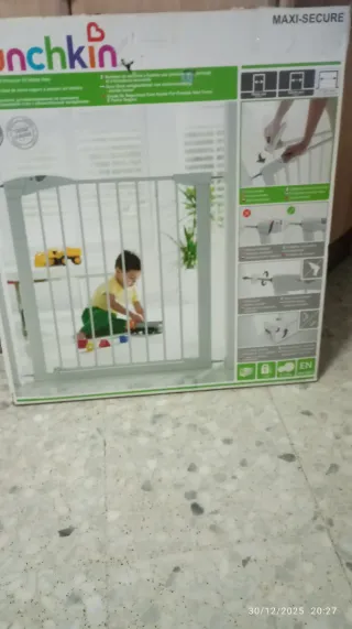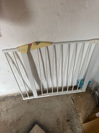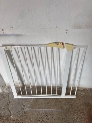 Puerta de seguridad para escaleras, ideal para mantener a los niños y mascotas a salvo. - Barrera de metal blanco. - Mecanismo de cierre. - Se ajusta a diferentes anchos. Medidas una mide 0.70 y la otra 0.30 altura 0.76 . A pesar de estar montada nunca se ha puesto.