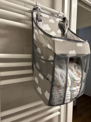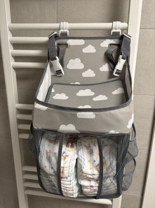 Práctica pañalera con un diseño de nubes grises y blancas. Se cuelga fácilmente en barreras o estanterías. Doble sistema de agarre. Compartimentos de malla en la parte central para pañales y en los laterales para meter cremas o accesorios de bebe.