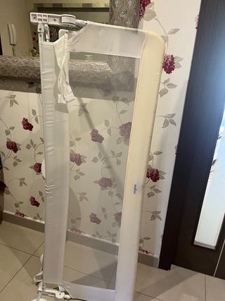 Barrera de seguridad para cama infantil. Se pliega sin problemas, quedando como se ve en la imagen 3. Para levantarla a partir de esa posición hay que alinear el tope con el hueco como se indica en la fotografía 4 y luego bajarlo según la 5ª imagen. Se rompió la pieza hace tiempo, pero ha seguido funcionando sin problemas.
