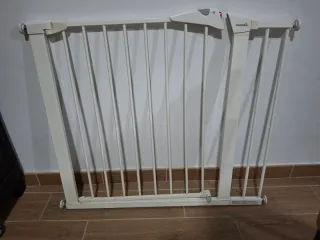 Barrera Seguridad Niños Escaleras con Extension hasta 21 cm - No es necesario hacer Agujeros - También vale como Puerta para Perros - Se puede adaptar desde 96 a 101 cm - Color Blanco. Se ha usado 2-3 veces máximo de forma puntual en casa de los abuelos. Precio original 55€.