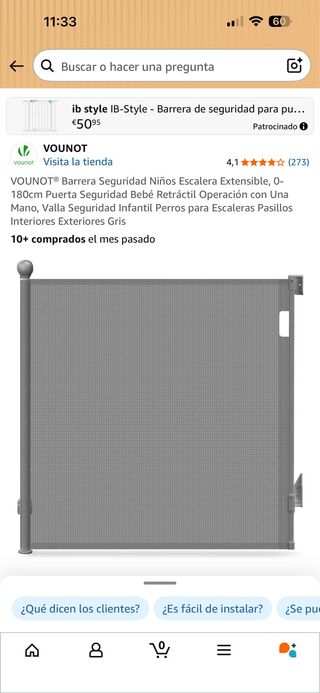 Barrera de seguridad extensible de la marca VOUNOT, ideal para escaleras o pasillos. Es retráctil y se opera con una mano. - Color gris. - Material de malla. - Altura: 0-180cm.