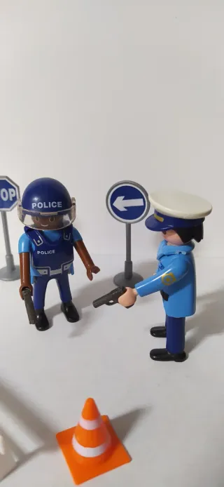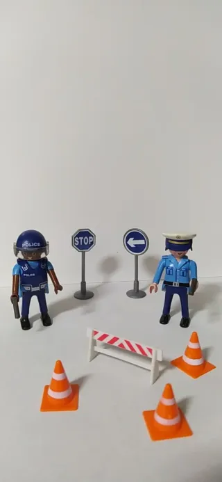 Set de figuras de Playmobil con temática policial. Incluye dos agentes, señales de tráfico y elementos de seguridad vial. - Dos figuras de policía con uniformes detallados. - Señal de STOP. - Señal de dirección (flecha azul). - Barrera de obras. - Tres conos de tráfico naranjas.