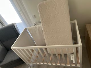 se vende cuna convertible en sofá de juego, tiene ropa de cuna nórdico, almohada. Está muy cuidada y la ropa muy poco usada de la marca Ikea en color blanco - Diseño clásico y funcional. - Barreras de seguridad.