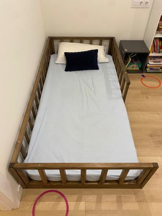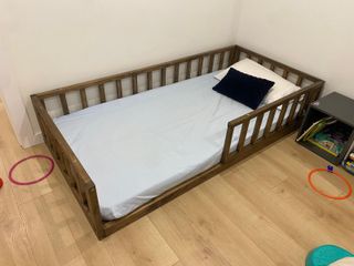 Cama de estilo Montessori fabricada en madera a ras de suelo, con somier de lamas de madera. Para colchón de 90x190cm Medidas aprox: 98cm (ancho) x 198cm (largo) x 40cm (alto barreras) Material: madera acabada con tinte al agua para interiores en tono nogal mate Peso máximo recomendado por el fabricante: 120kg ** no incluye colchón (se puede incluir por +20€, colchón viscoeléstico de aprox. 15cm de grosor, dureza media, usable por las dos caras) ** no se envía, sólo compra en persona