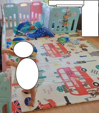 Conjunto de parque infantil y alfombra de juegos, ambos plegables para facilitar su almacenamiento y transporte. El parque infantil es de la marca HOMCOM: 14 paneles con juguetes en las paredes. 149x155x64cm - Paneles de colores: verde, blanco y rosa. Nosotros no lo hemos usado como parque cerrado sino como barreras para proteger al bebé de los muebles y para que se agarre y aprenda a caminar, como se ve en las fotos. Alfombra De Juegos Para Bebés marca Babify. Espesor 1.5 Cm (Plegable, Antideslizante, Reversible, Impermeable, Portátil, 176x195x1,5) Diseño de Londres y autobuses. Precio de parque+alfombra.