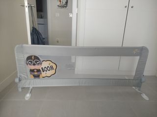 Barrera de seguridad para cama infantil. Se ha usado una semana únicamente. Se ha descosió una pequeña esquina al montarlo, pero no afecta para nada a la funcionalidad. Tiene un sistema por el que se puede bajar y subir completamente la barrera